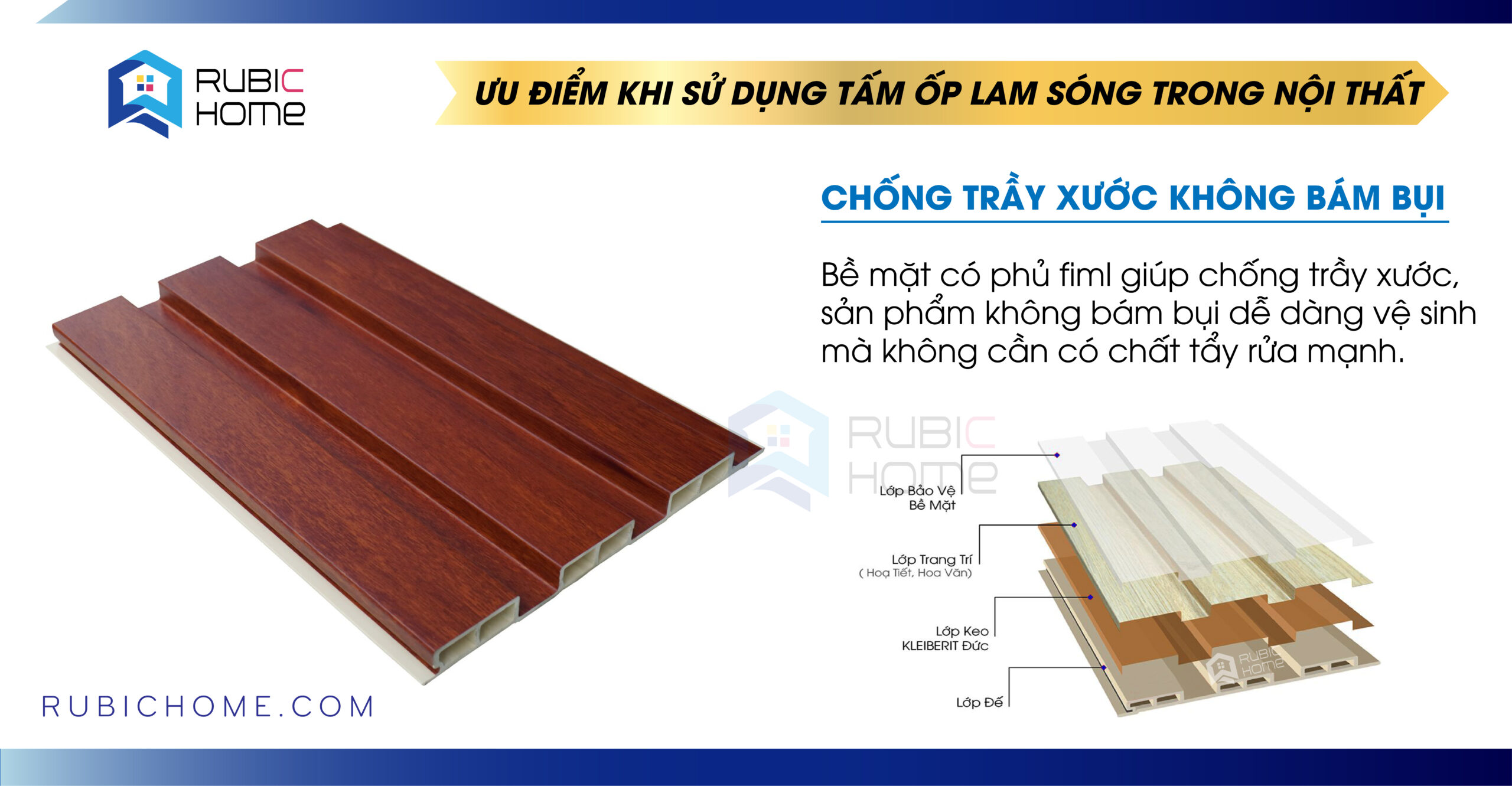 - Dễ dàng vệ sinh: do không thấm nước và chống mối mọt tốt nên việc vệ sinh với tấm ốp lam sóng rất dễ dàng, hoàn toàn có thể làm sạch tấm với rẻ ướt, ngoài ra tấm còn khả năng chống bám bụi lên bề mặt nhở lớp vân bên trên tấm.